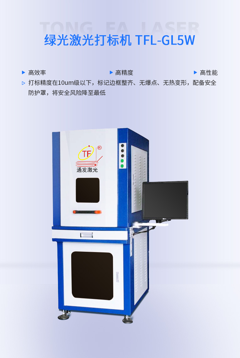 通發(fā)激光研發(fā)的TFL-GL3W/5W 綠光激光打標(biāo)機(jī)配備安全防護(hù)罩,避免設(shè)備操作員誤操作引起的人身傷害,將安全風(fēng)險(xiǎn)降至最低,產(chǎn)品遠(yuǎn)銷海內(nèi)外.打標(biāo)精度在10μm級(jí)以下,標(biāo)記邊框整齊、無(wú)爆點(diǎn)、無(wú)熱變形,有效提高加工的成品合格率,使用壽命長(zhǎng)、配合全封密光路、特別加固的光路底座滿足長(zhǎng)期、穩(wěn)定性的工作需要。