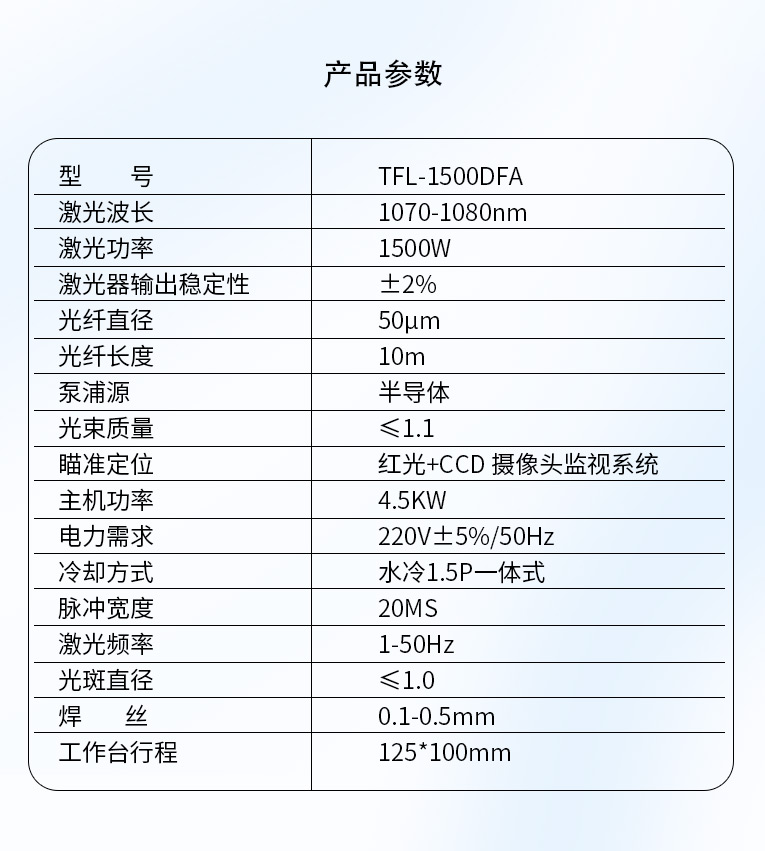 采用光纖激光器,反射率高,能量強(qiáng),免維護(hù),免調(diào)光,功耗少,相比傳統(tǒng) 模具焊來說,安全,穩(wěn)定性好超長(zhǎng)使用壽命。 1500W光纖激光器,滿足銅、鋁焊接量大的模具及產(chǎn)品焊接加工需要。 高承重底座及工作臺(tái),保持輕便靈活的優(yōu)點(diǎn),同時(shí)提供更高承載能力。 配備.1.5P大功率一體式水冷水機(jī),保證了大功率焊接的穩(wěn)定性。